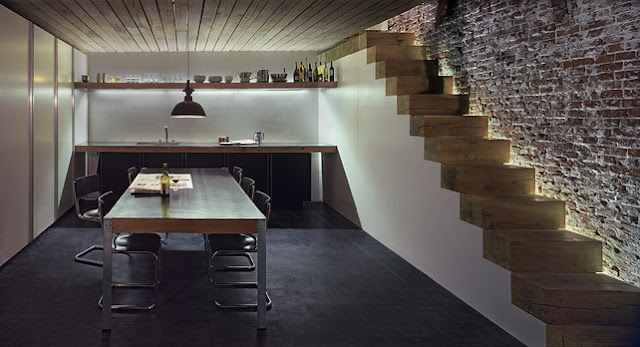 The dominant materials are rough wood, zinc, plaster and re-exposed brick masonry. The colour scheme is essentially restricted to white, black, and shades of grey.......more
