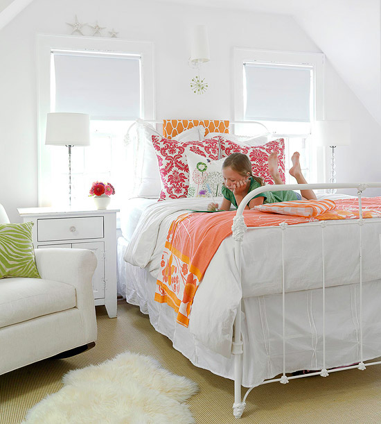 Color tastes and trends change, and in a child's room especially, it's nice to have the luxury of a new look fairly often. Opt for an all white scheme for bedding, walls, and furniture. Swap out the coverlet, pillows, or throw on the bed. All are easy enough to change and will make it seem like you have a new room every season. Use a yard of fabric to add a shot of color and pattern to a headboard, as seen in the photo.